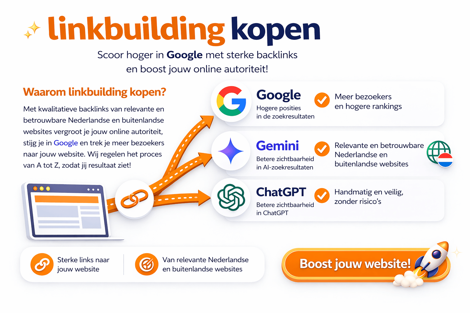 Linkbuilding is een belangrijk onderdeel van SEO (zoekmachineoptimalisatie). Door sterke en relevante backlinks naar jouw website te plaatsen, ziet Google jouw site als betrouwbaarder. Hierdoor stijg je in de zoekresultaten en trek je meer bezoekers aan. Met de linkbuilding pakketten van R&B Webpromotions zorgen we voor kwalitatieve links die passen bij jouw branche. Zo werk je gericht aan meer zichtbaarheid, meer autoriteit en uiteindelijk meer aanvragen.